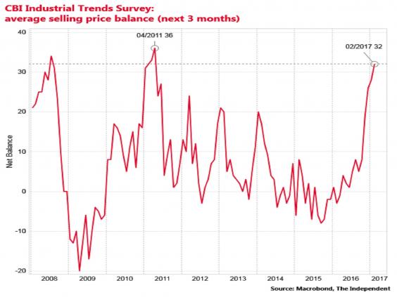 The CBI data is consistent with Office for National Statistics data which last week showed factory input prices rising at an annual rate of 20.5 per cent in January.