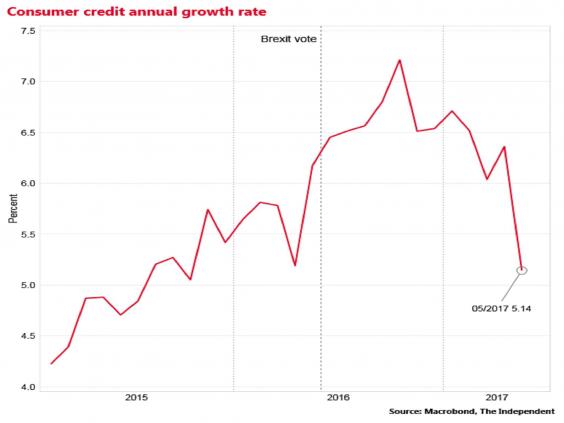 According to the the latest data from the British Bankers Association, the annual growth in consumer spending eased to 5.1 per cent in the month, down from the 6.4 per cent rate recorded in April. It was the weakest growth rate since October 2015.