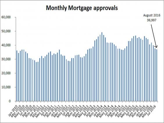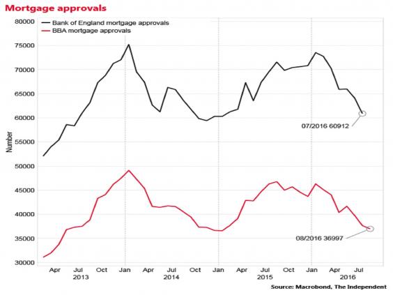 The number of loan approvals for house purchase by high street banks was 36,997 in August, down 21 per cent on the same month a year earlier and the lowest monthly total since January 2015.
