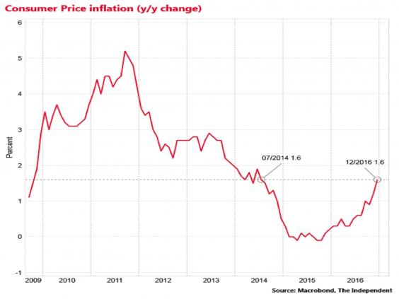 Inflation unexpectedly jumped to 1.6 per cent in December - the highest rate since July 2014 - in a clear sign that the slump in the pound is now feeding into domestic prices.