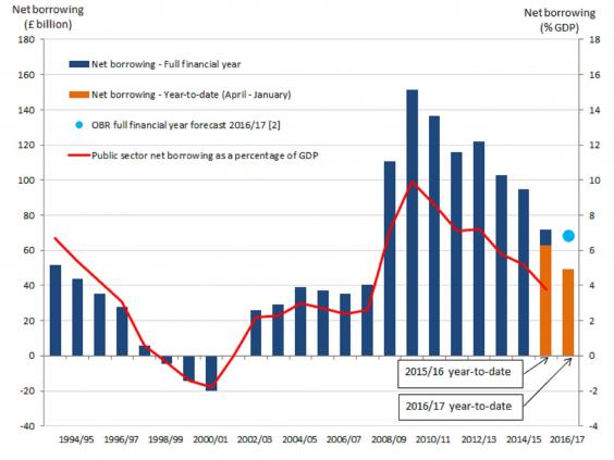 Total borrowing for the fiscal year to date, with two months remaining, is £49.3bn, down from £62.9bn at the same stage in 2015-16.