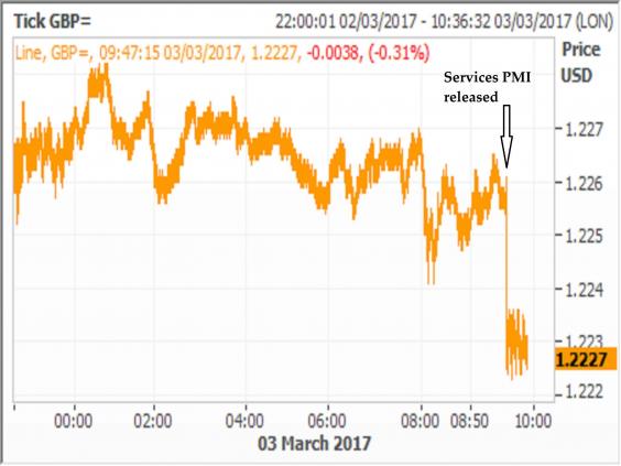 The latest services PMI showed the fastest rate of cost inflation in eight and a half years thanks to the 12 per cent plunge in the trade-weighted value of the pound since last June's referendum.