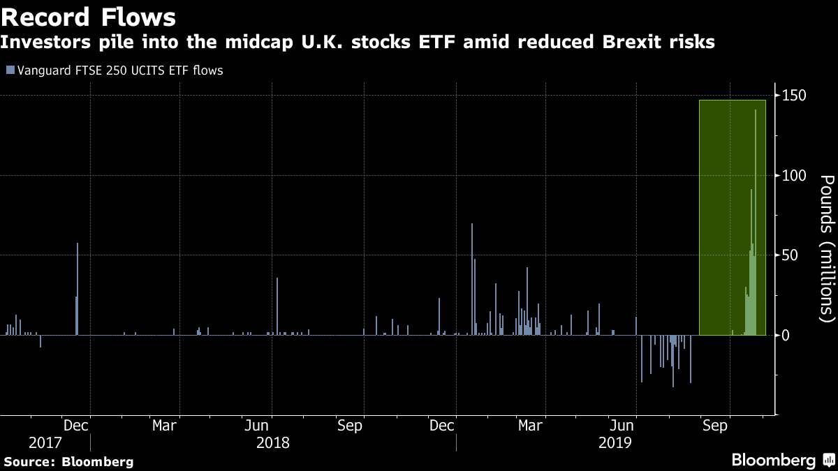 Record inflows into U.K. equity exchange-traded funds could be part of the reason for the turnaround in European equity data. The Vanguard FTSE 250 UCITS ETF, which tracks the benchmark index of mid-cap British firms that are more sensitive to domestic growth, saw historically high inflows throughout this week. The iShares Core FTSE 100 UCITS ETF, which follows the benchmark gauge of large U.K. companies, also experienced inflows.
