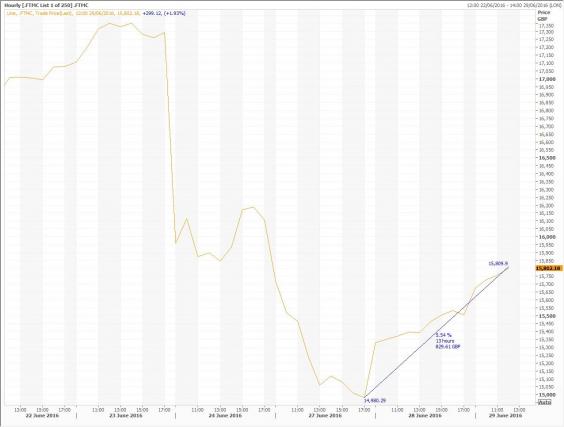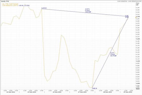 Shares are also now higher. This morning the FTSE 100 index of London-listed blue chip shares was trading at 6,300, up 2.62 per cent on the day and now only 0.55 per cent lower than where the index closed last Thursday before the referendum result was made public.