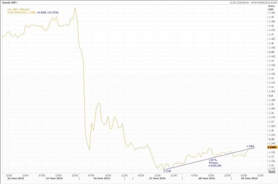 Sterling this morning was trading at $1.3403, up almost two per cent from the low of $1.3148 hit on Monday (which was the lowest value of the pound against the dollar in 31 years).