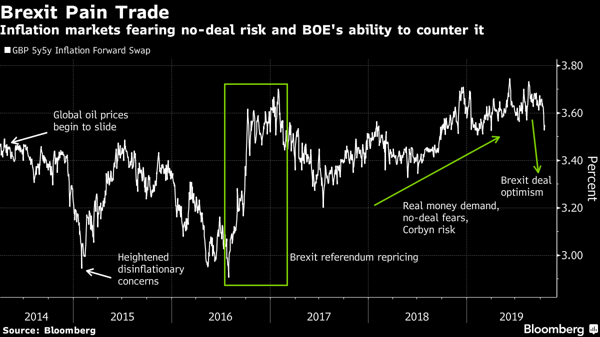 Betting on lower inflation expectations has been a painful trade for investors in recent years. The persistent high level, given a no-deal exit from the European Union would lead to a pound slump and a spike in prices, appears in contrast to the U.K.’s sagging economy.