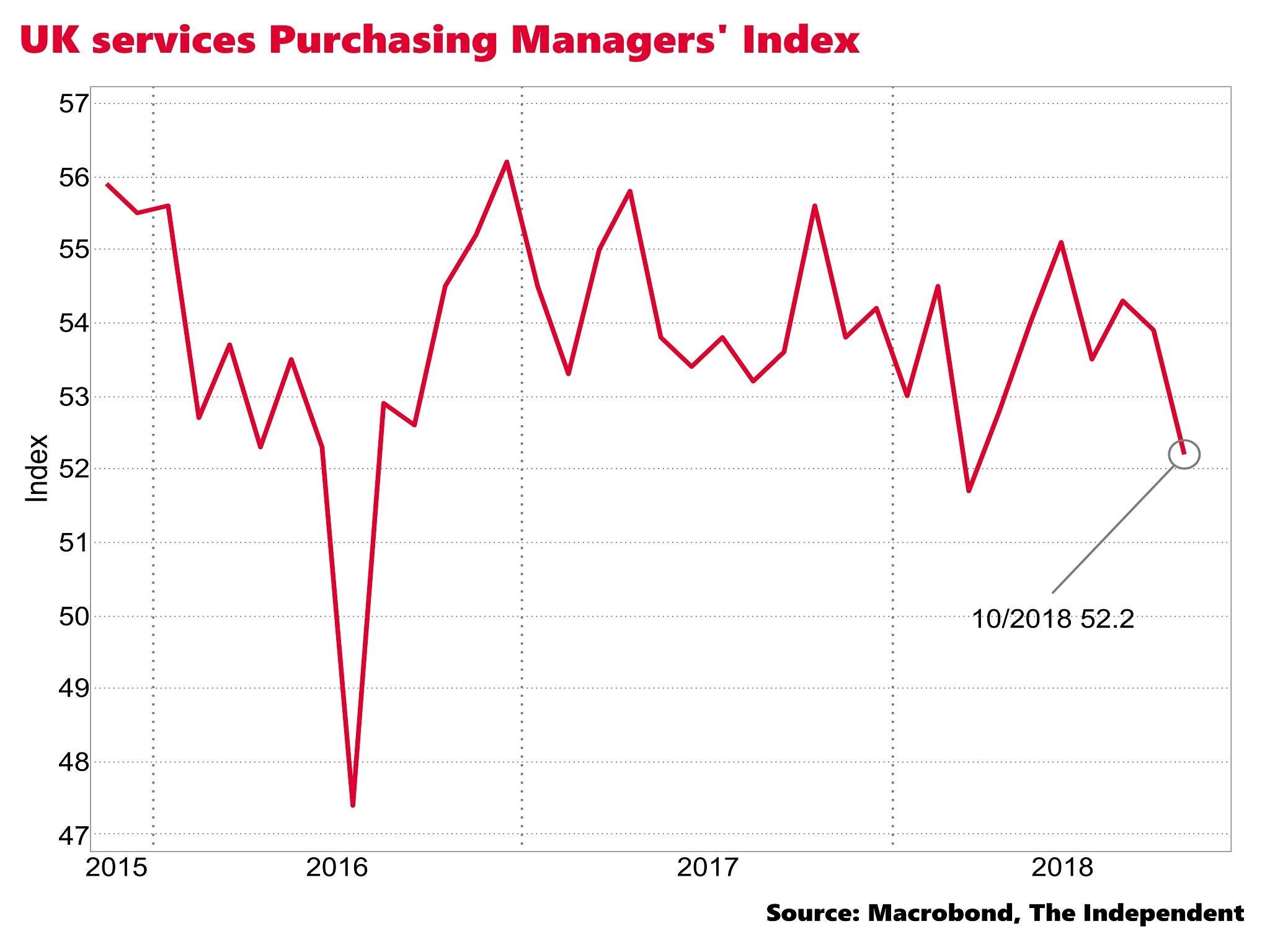 The overall activity index dropped to 52.2 in the month, the weakest since March, and below City of London analysts’ expectations of 53.3.