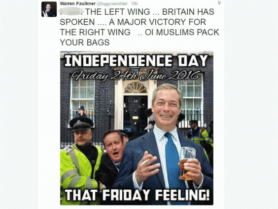 But Warren Faulkner, whose Twitter handle is @foggyneiinfidel, replied: "Great news...you can pack your bags, you're going home...BYE THEN."