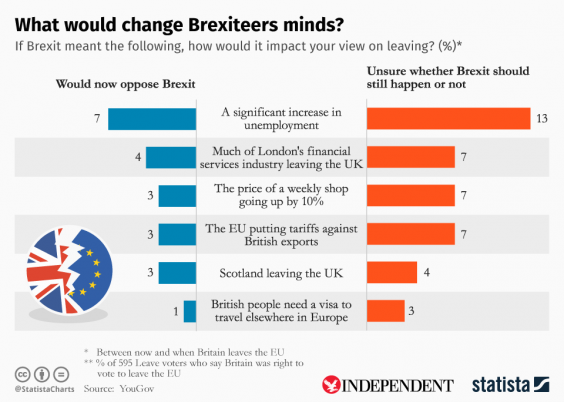 The pollsters found that if the number of people not employed rose significantly, 7 per cent of people would object to Brexit and 13 per cent would become unsure.