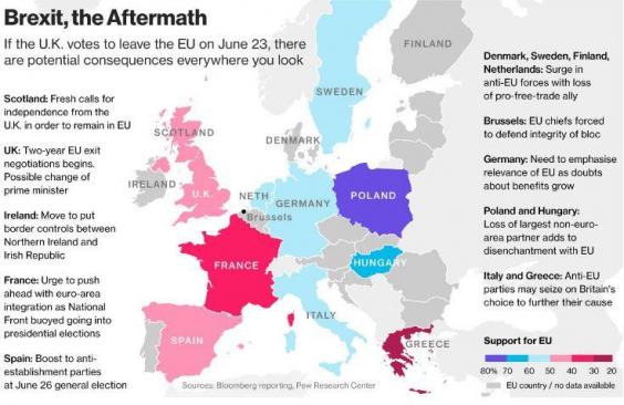 Before dawn on June 24, if an exit vote becomes clear, the EU’s top brass from Berlin to Brussels will be forced into damage control. In echoes of the Greek debt crisis, euro-area finance ministers may hold an emergency meeting as soon as that evening. Wild swings in the pound, more aggressive interventions by the Swiss National Bank and a ratcheting up of global instability rank as likely market reactions.