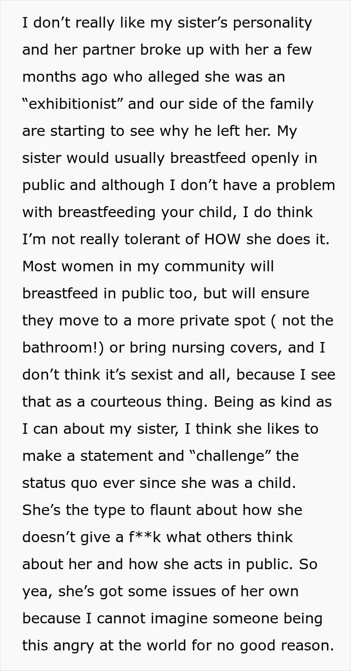 The thing is that the OP’s sister always prefers to breastfeed (her eldest daughter is 2 years old and she did this the same way too), not at all embarrassed by those around her, and without covering up the baby’s head or anything. In turn, the author considered this behavior to be a kind of manifestation of ‘exhibitionism’ – and did not at all want to have these breastfeeding moments on camera.