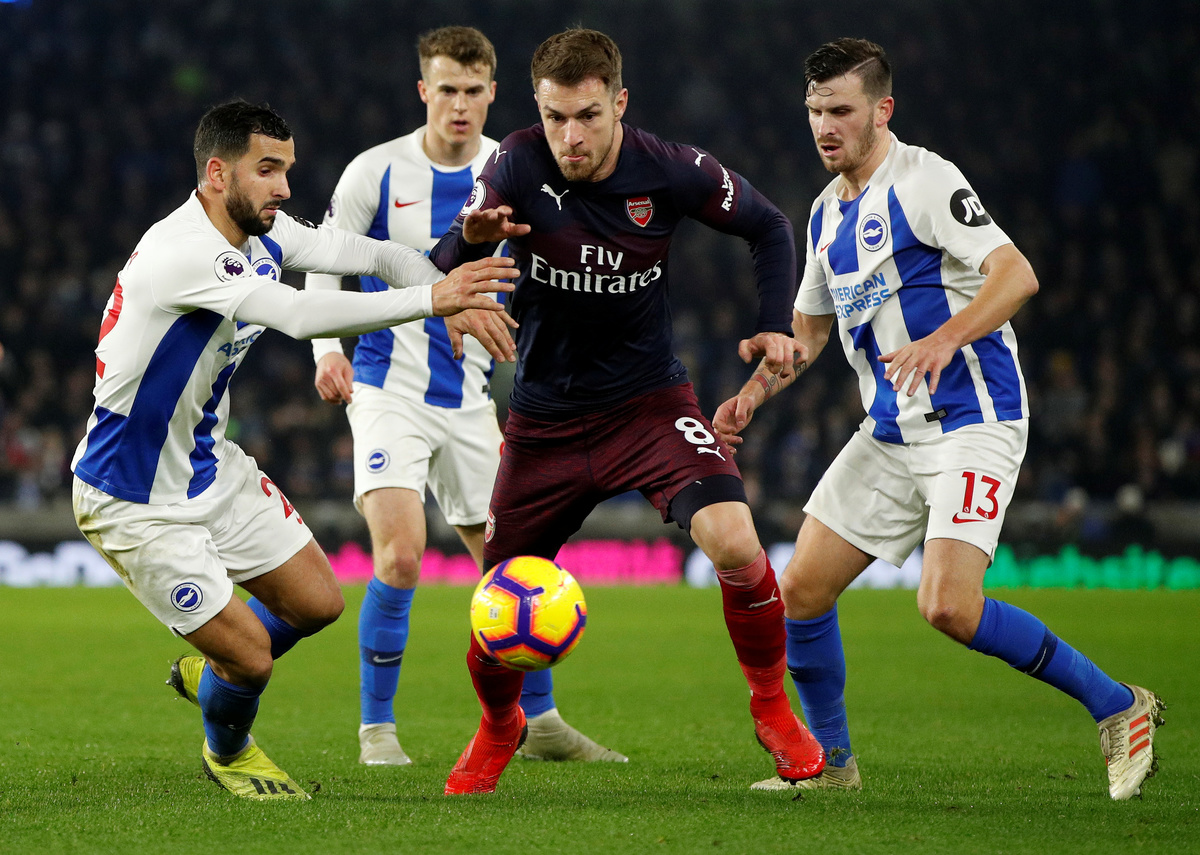 Soccer Football - Premier League - Brighton & Hove Albion v Arsenal - The American Express Community Stadium, Brighton, Britain - December 26, 2018 Arsenal's Aaron Ramsey in action with Brighton's Martin Montoya (L) and Pascal Gross (R) Action Images via Reuters/John Sibley