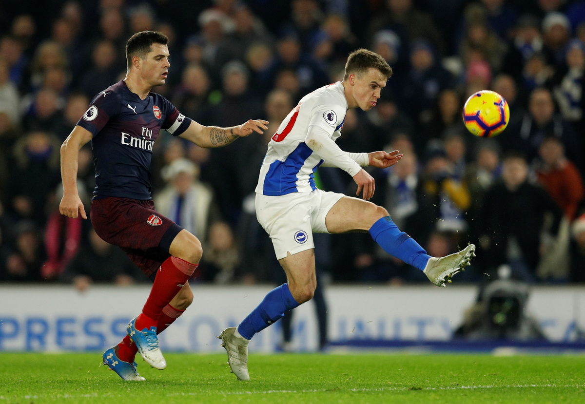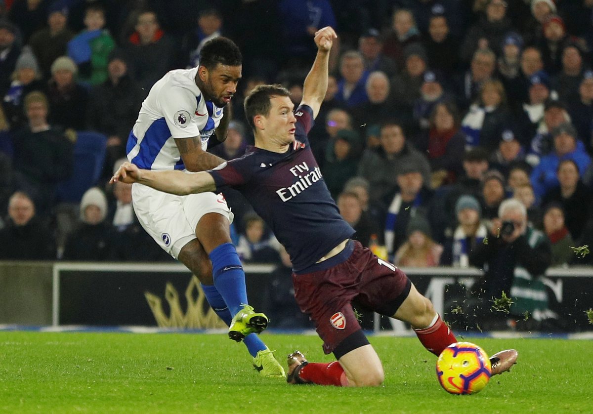 Soccer Football - Premier League - Brighton & Hove Albion v Arsenal - The American Express Community Stadium, Brighton, Britain - December 26, 2018 Brighton's Jurgen Locadia misses a chacne to score as Arsenal's Stephan Lichtsteiner attempts to block the shot REUTERS/Peter Nicholls