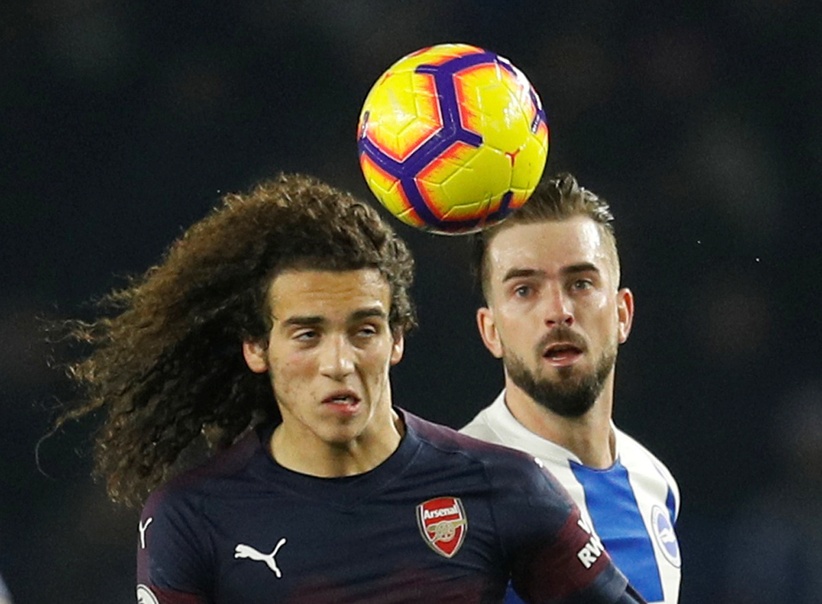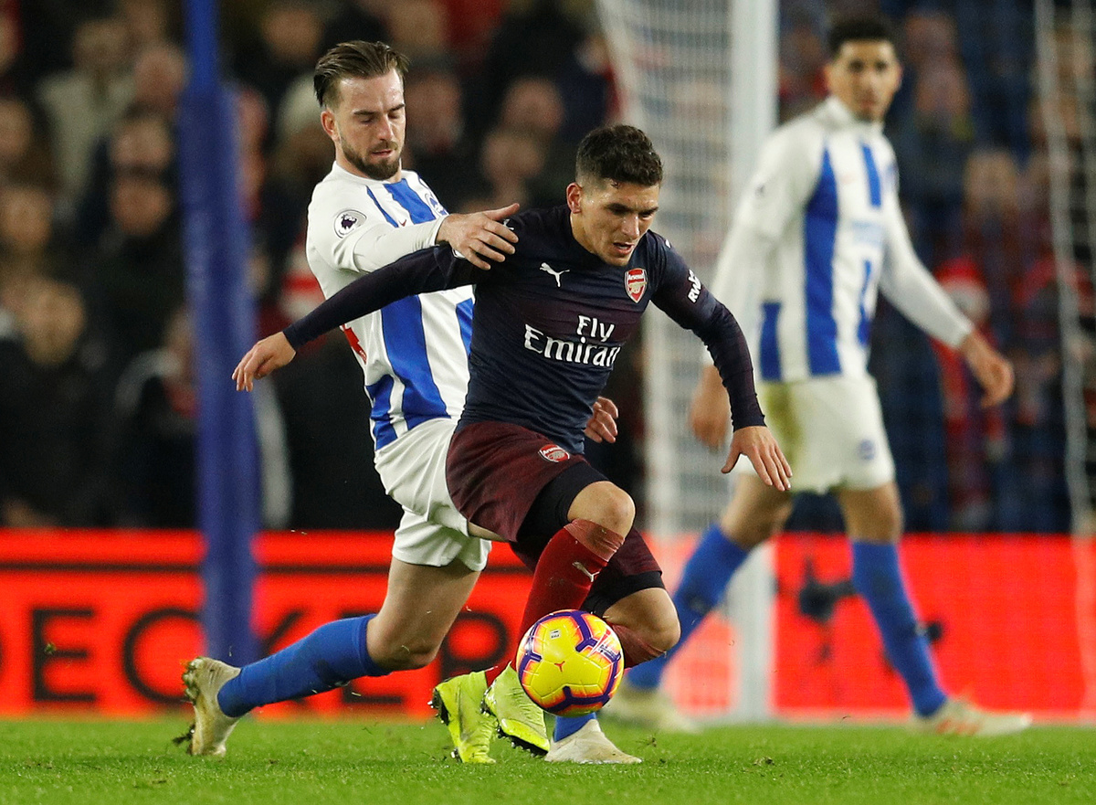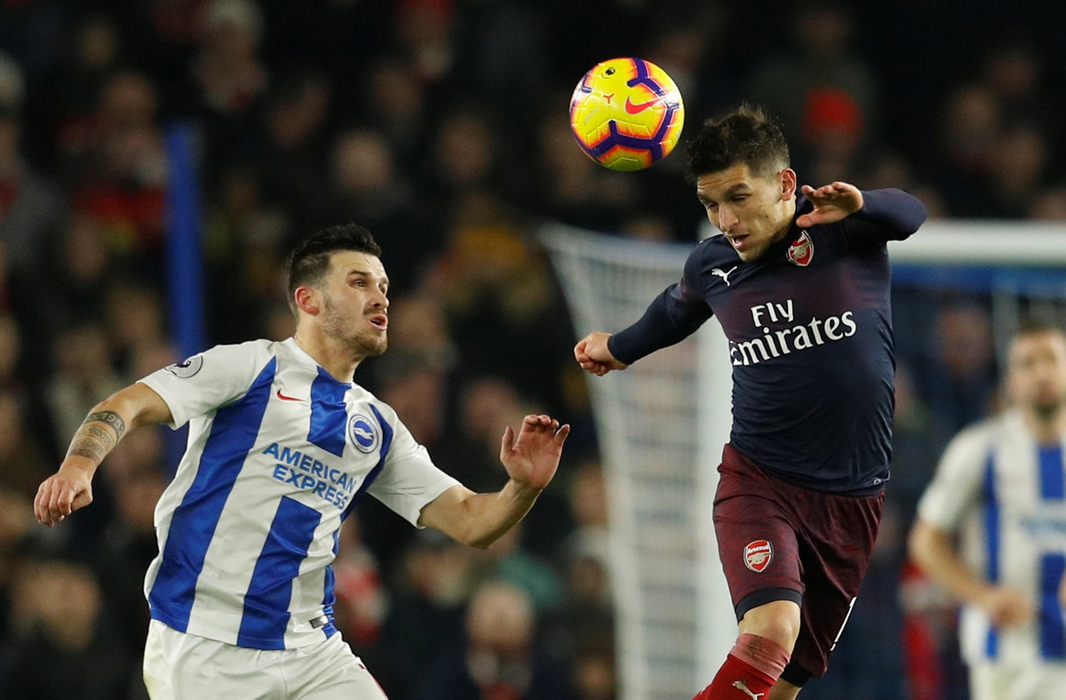 Soccer Football - Premier League - Brighton & Hove Albion v Arsenal - The American Express Community Stadium, Brighton, Britain - December 26, 2018 Arsenal's Lucas Torreira in action with Brighton's Davy Propper REUTERS/Peter Nicholls