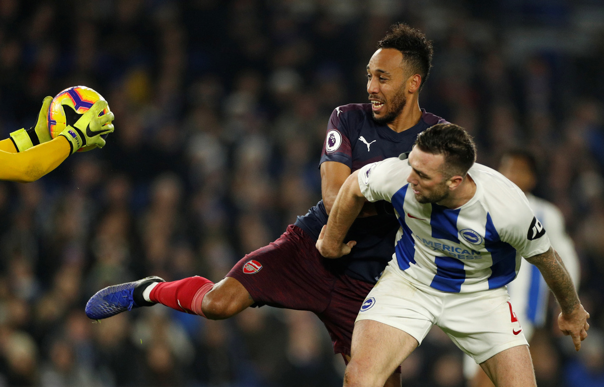 Soccer Football - Premier League - Brighton & Hove Albion v Arsenal - The American Express Community Stadium, Brighton, Britain - December 26, 2018 Arsenal's Pierre-Emerick Aubameyang in action with Brighton's Shane Duffy Action Images via Reuters/John Sibley