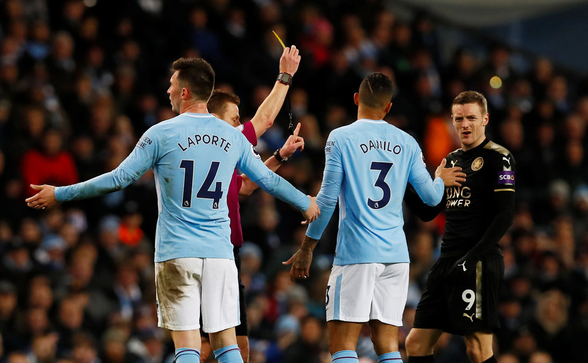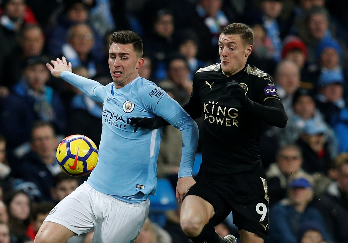 Soccer Football - Premier League - Manchester City vs Leicester City - Etihad Stadium, Manchester, Britain - February 10, 2018 Manchester City's Aymeric Laporte in action with Leicester City's Jamie Vardy REUTERS/Andrew Yates