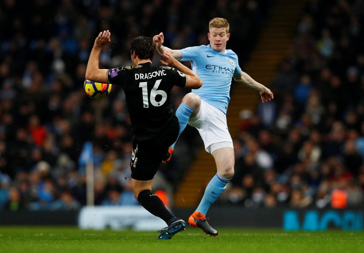 Soccer Football - Premier League - Manchester City vs Leicester City - Etihad Stadium, Manchester, Britain - February 10, 2018 Manchester City's Kevin De Bruyne in action with Leicester City’s Aleksandar Dragovic Action Images via Reuters/Jason Cairnduff