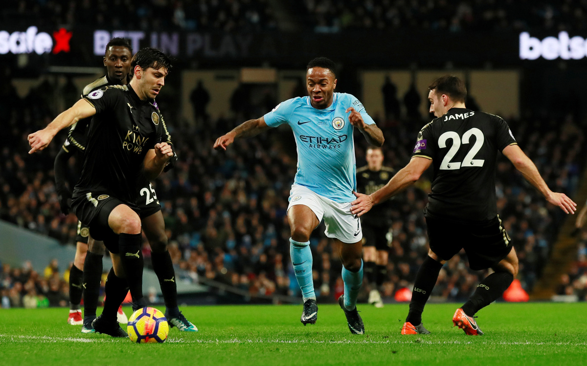 Soccer Football - Premier League - Manchester City vs Leicester City - Etihad Stadium, Manchester, Britain - February 10, 2018 Manchester City's Raheem Sterling in action with Leicester City's Matty James and Aleksandar Dragovic Action Images via Reuters/Jason Cairnduff