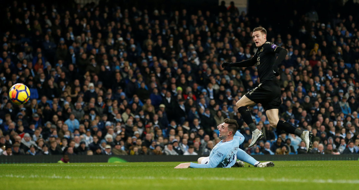Soccer Football - Premier League - Manchester City vs Leicester City - Etihad Stadium, Manchester, Britain - February 10, 2018 Leicester City's Jamie Vardy scores their first goal REUTERS/Andrew Yates