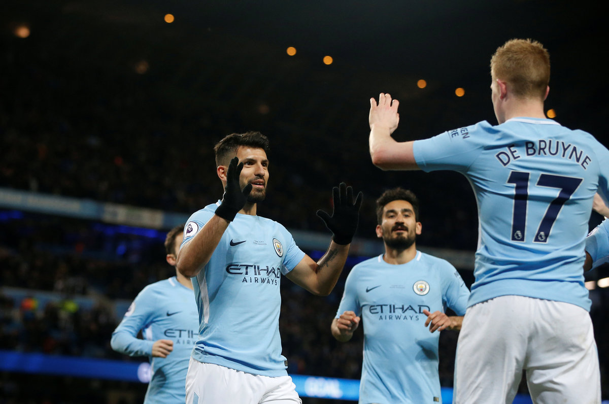 Soccer Football - Premier League - Manchester City vs Leicester City - Etihad Stadium, Manchester, Britain - February 10, 2018 Manchester City's Sergio Aguero celebrates scoring their fourth goal to complete his hat-trick REUTERS/Andrew Yates