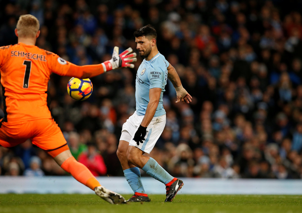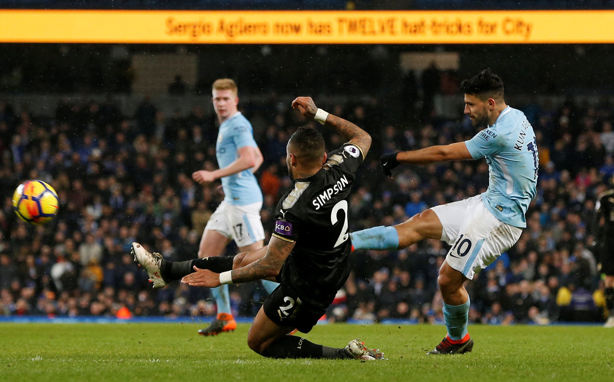 Soccer Football - Premier League - Manchester City vs Leicester City - Etihad Stadium, Manchester, Britain - February 10, 2018 Manchester City's Kyle Walker spits out water Action Images via Reuters/Jason Cairnduff Soccer Football - Premier League - Manchester City vs Leicester City - Etihad Stadium, Manchester, Britain - February 10, 2018 Manchester City's Raheem Sterling /goes round Leicester City's Kasper Schmeichel before his shot is blocked by Aleksandar Dragovic Action Images via Reuters/Jason Cairnduff Soccer Football - Premier League - Manchester City vs Leicester City - Etihad Stadium, Manchester, Britain - February 10, 2018 Manchester City's Sergio Aguero scores their second goal Action Images via Reuters/Jason Cairnduff Soccer Football - Premier League - Manchester City vs Leicester City - Etihad Stadium, Manchester, Britain - February 10, 2018 Manchester City's Sergio Aguero celebrates scoring their second goal with Kevin De Bruyne REUTERS/Andrew Yates Soccer Football - Premier League - Manchester City vs Leicester City - Etihad Stadium, Manchester, Britain - February 10, 2018 Manchester City's Sergio Aguero scores their third goal REUTERS/Andrew YatesSoccer Football - Premier League - Manchester City vs Leicester City - Etihad Stadium, Manchester, Britain - February 10, 2018 Leicester City's Riyad Mahrez in action REUTERS/Andrew Yates Soccer Football - Premier League - Manchester City vs Leicester City - Etihad Stadium, Manchester, Britain - February 10, 2018 Manchester City's Sergio Aguero scores their fourth goal to complete his hat-trick REUTERS/Andrew YatesSoccer Football - Premier League - Manchester City vs Leicester City - Etihad Stadium, Manchester, Britain - February 10, 2018 Leicester City's Jamie Vardy is shown a yellow card by referee Mike Jones Action Images via Reuters/Jason CairnduffSoccer Football - Premier League - Manchester City vs Leicester City - Etihad Stadium, Manchester, Britain - February 10, 2018 Manchester City's Sergio Aguero scores their fifth goal REUTERS/Andrew Yates