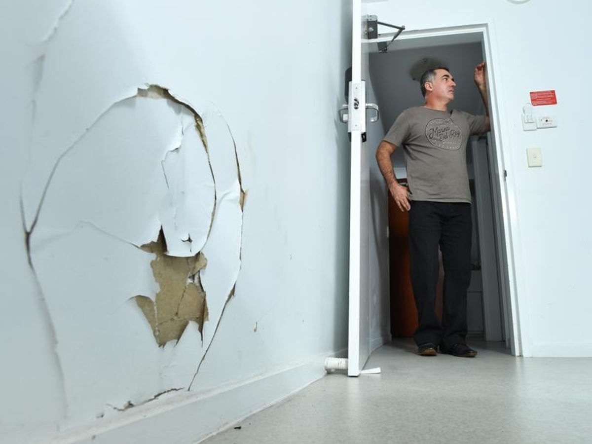 The damage is worst in a four-story accommodation tower. Security doors leading out to balconies have been clumsily secured with additional locks. Some windows have been screwed shut and cannot be opened.