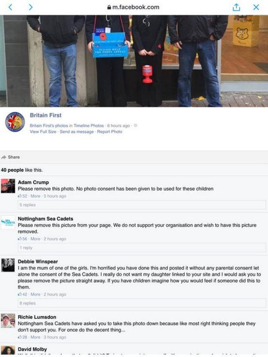 The picture, which was posted by the group on Saturday evening, is one of a series of presumed Britain First members taking photographs with poppy sellers across the country - including another photograph taken with young army cadets.