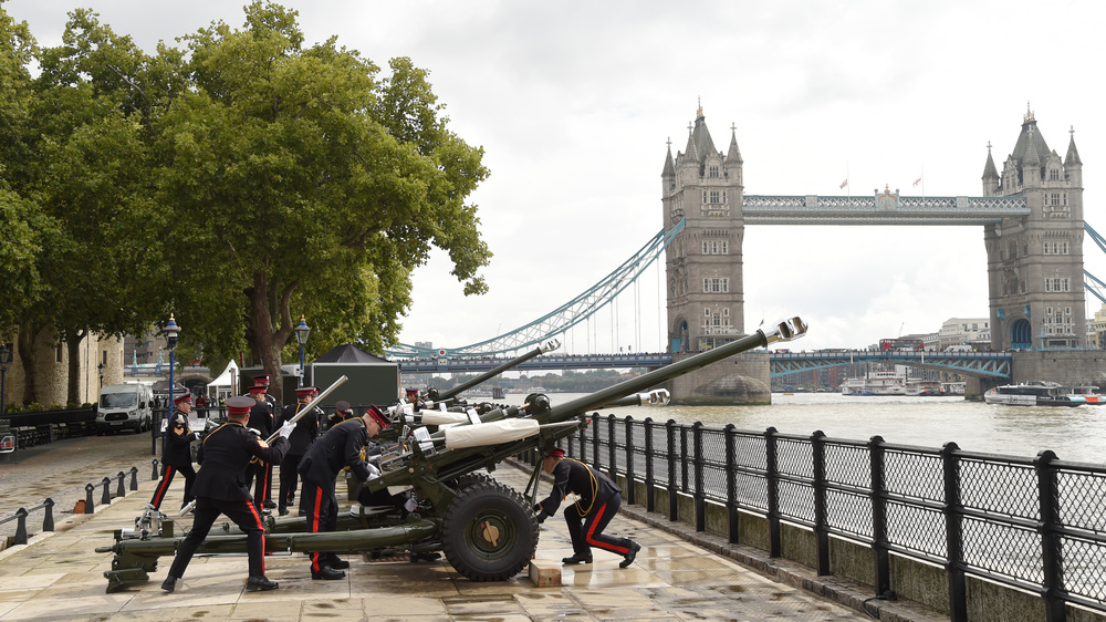 Two 96-round gun salutes honoring the queen — one round for each year of her life — are fired at 1 p.m. local time Friday in London, in Hyde Park and at the Tower of London.