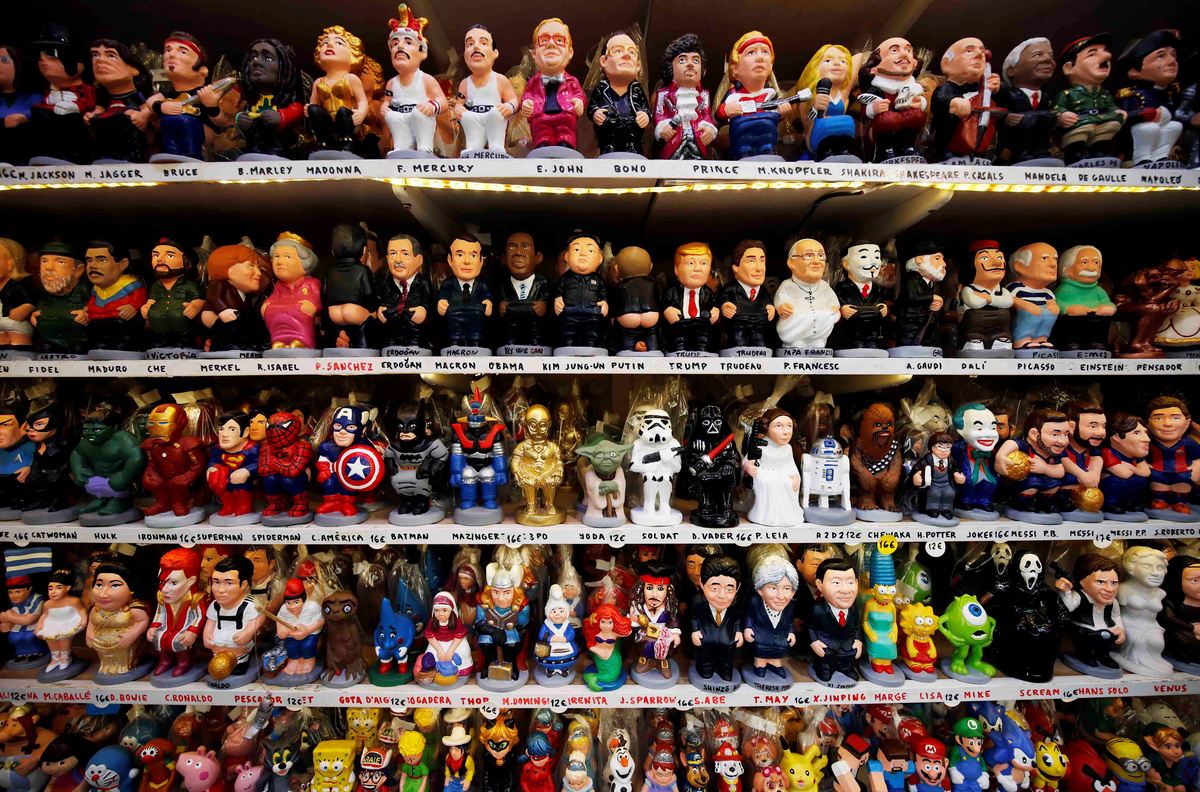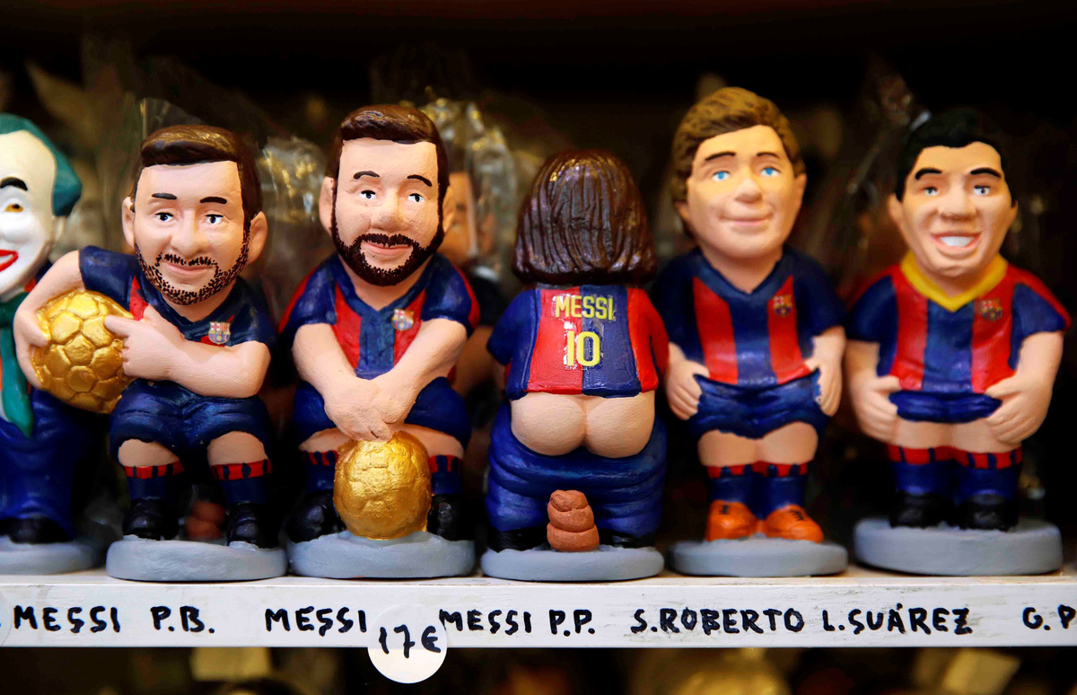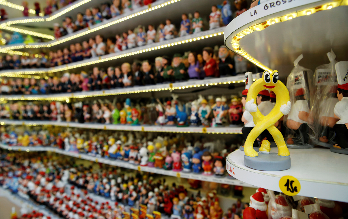 Clay "caganers" figures representing French President Emmanuel Macron, German Chancellor Angela Merkel, British Prime Minister Theresa May and Russian President Vladimir Putin are displayed at the Santa Llucia Christmas market in central Barcelona, Spain, December 14, 2018. REUTERS/Albert GeaA man makes a "caganer", or defecator, depicting former Catalan president Carles Puigdemont with a mould, in a pottery in Torroella de Montgri, near Girona, Spain, December 14, 2018. REUTERS/Albert GeaClay "caganers" figures representing a yellow ribbon (the symbol used to demand the release of jailed Catalonian politicians) is sold at the Santa Llucia Christmas market in central Barcelona, Spain, December 14, 2018. REUTERS/Albert GeaClay "caganers" figures representing FC Barcelona's players Lionel Messi, Sergi Roberto and Luis Suarez are displayed at the Santa Llucia Christmas market in central Barcelona, Spain, December 14, 2018. REUTERS/Albert Gea