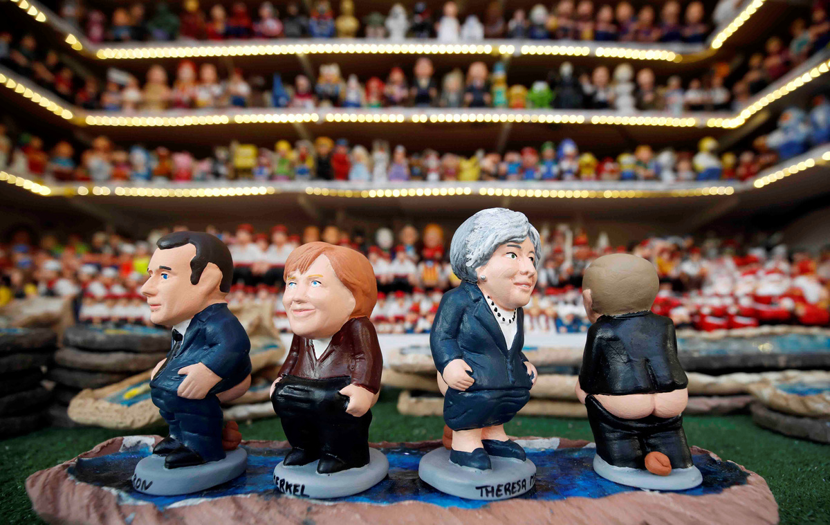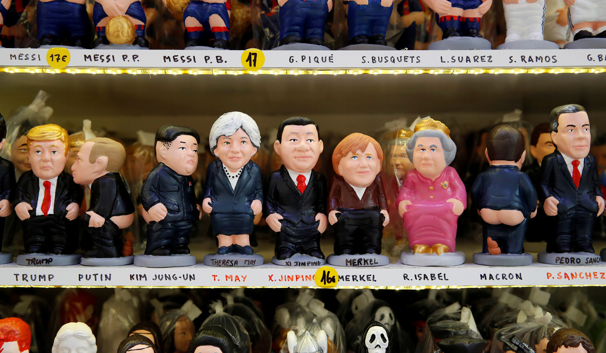 Clay "caganers" figures representing U.S. President Donald Trump, Russian President Vladimir Putin, North Korean leader Kim Jong Un, British Prime Minister Theresa May, Chinese President Xi Jinping, German Chancellor Angela Merkel, Queen Elizabeth II, French President Emmanuel Macron, and Spanish Prime Minister Pedro Sanchez are displayed at the Santa Llucia Christmas market in central Barcelona, Spain, December 14, 2018. REUTERS/Albert Gea