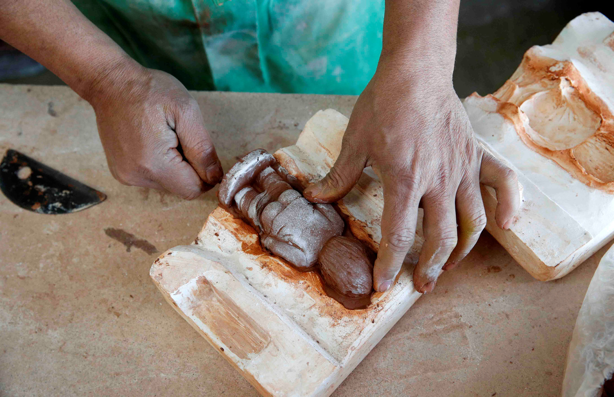 A man makes a "caganer", or defecator, depicting former Catalan president Carles Puigdemont with a mould in a pottery in Torroella de Montgri, near Girona, Spain, December 14, 2018. REUTERS/Albert Gea
