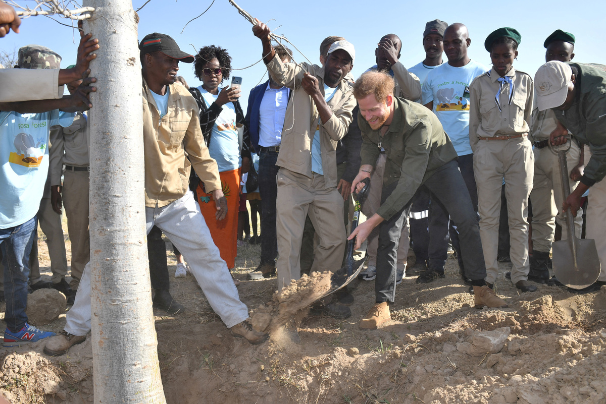 The 35-year-old's solo visit to Botswana began at a conservation project where he joined school children to plant trees and raise awareness of the fragility of local ecosystems.