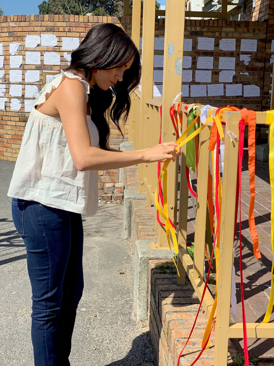 CAPE TOWN, South Africa (Reuters) - Meghan, the wife of Britain's Prince Harry, has tied a ribbon at the site in Cape Town where a student was murdered last month, in a gesture of solidarity with those who have taken a stand against gender-based violence.