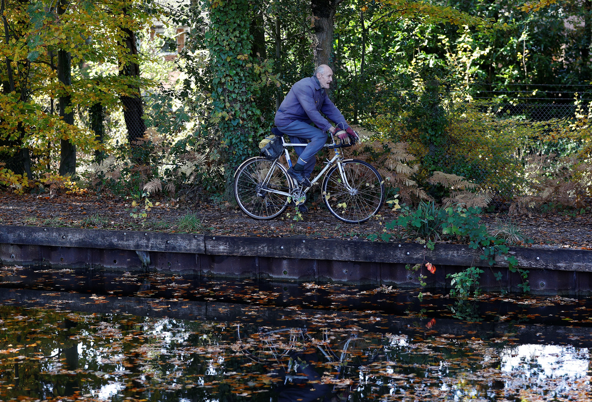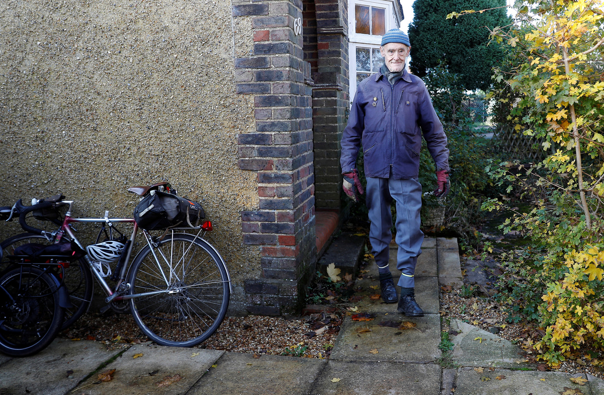 82 year old cyclist Russ Mantle leaves his home as he prepares for a cycle ride during which he will complete his millionth mile, in Aldershot, Britain November 7, 2019. REUTERS/Peter Nicholls