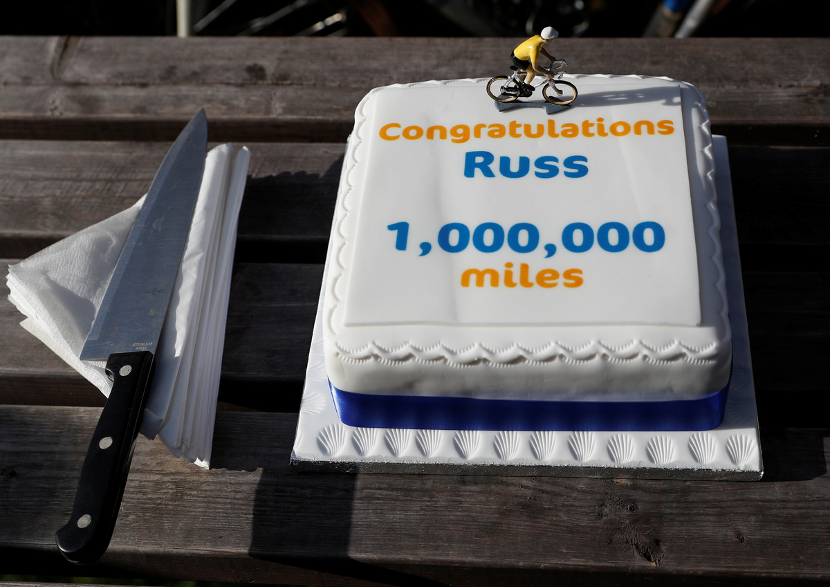 A cake made for 82 year old cyclist Russ Mantle who completed his millionth mile is seen in Mytchett, near Aldershot, Britain November 7, 2019. REUTERS/Peter Nicholls