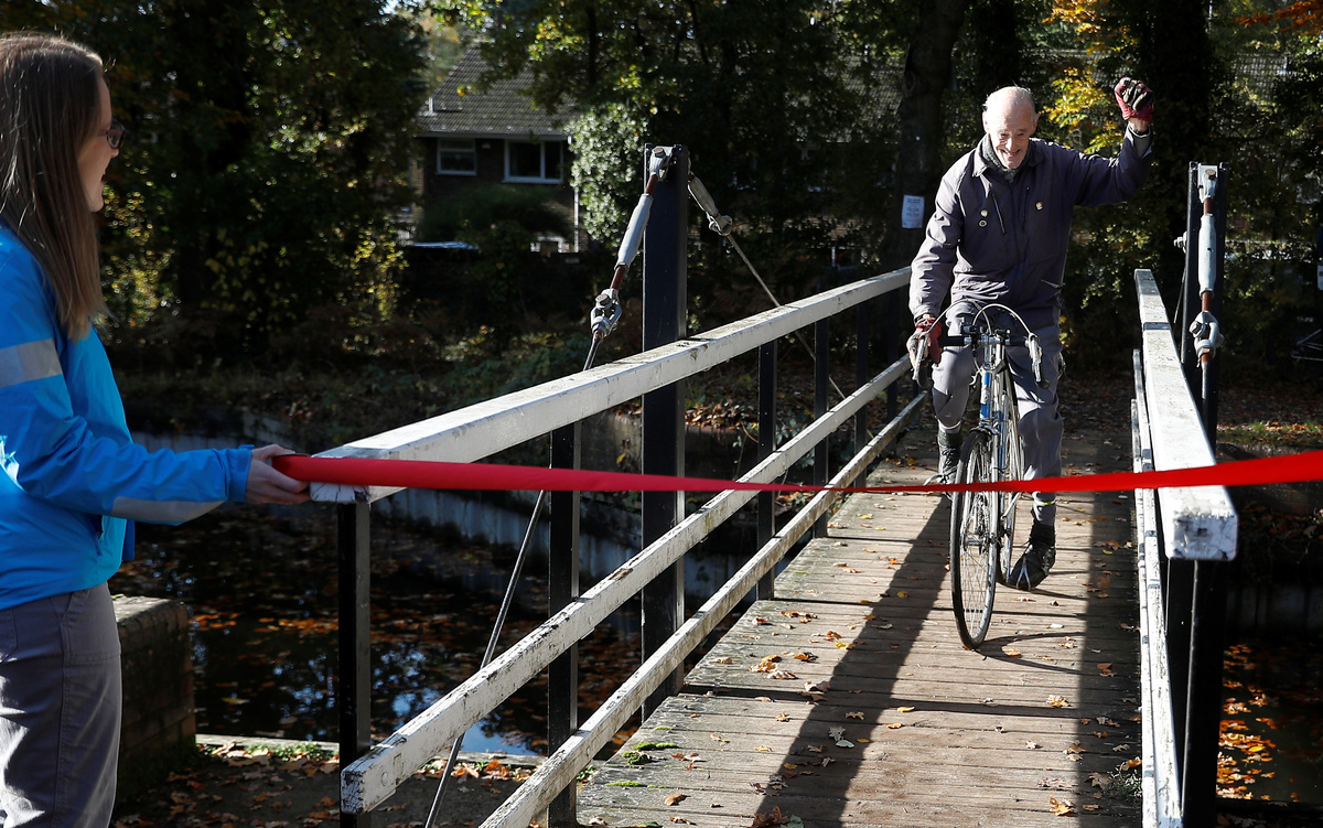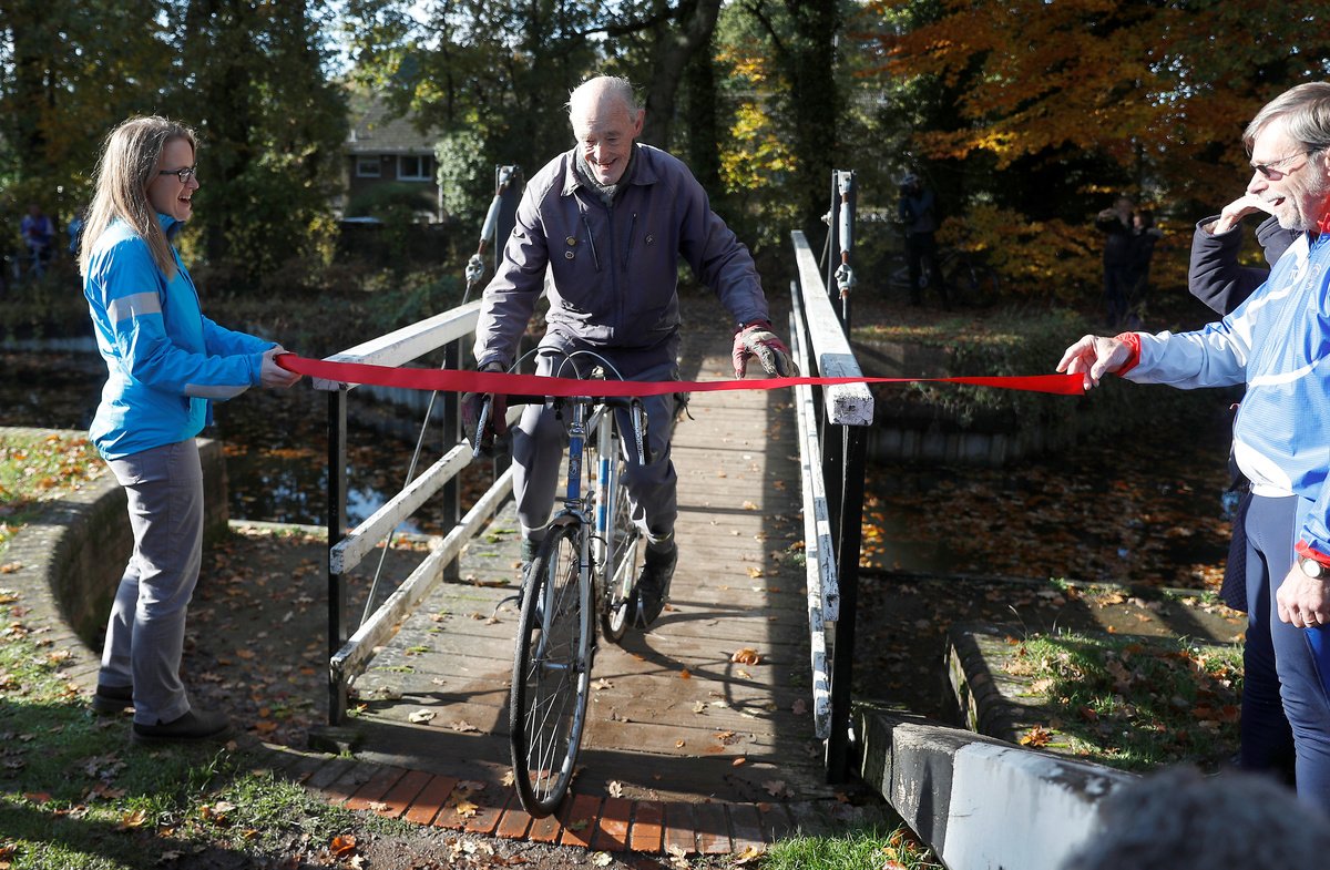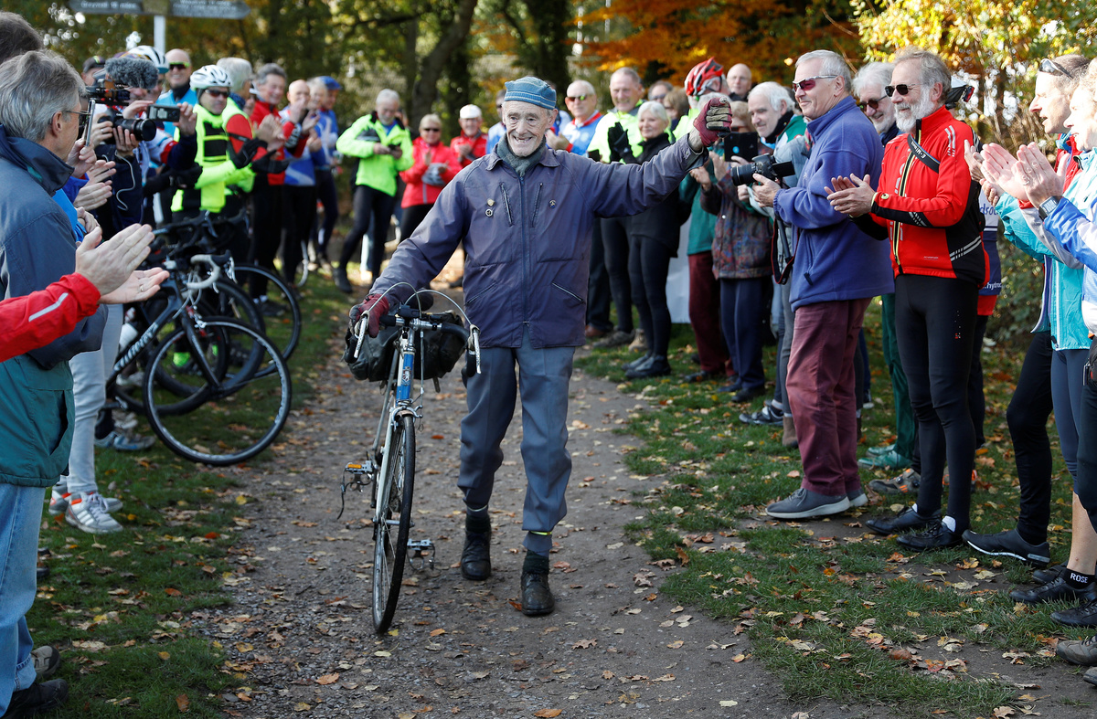 82 year old cyclist Russ Mantle celebrates after cycling his millionth mile following a ride in Mytchett, near Aldershot, Britain November 7, 2019. REUTERS/Peter Nicholls