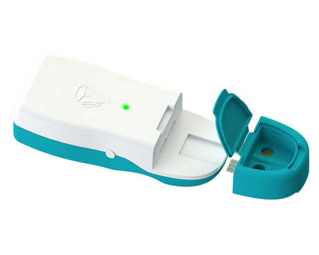 Users deposit a saliva sample in a sensor unit, before shaking and inserting into a cartridge device. The reader is connected, via Bluetooth, to a smartphone, and the results will appear on a mobile app.