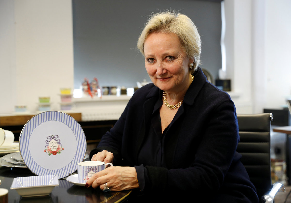 Halcyon Days Chairman & CEO Pamela Harper poses with china made to celebrate the Royal Wedding of Prince Harry and Meghan Markle at their Caverswall factory in Stoke-on-Trent, Britain February 27, 2018. REUTERS/Darren Staples