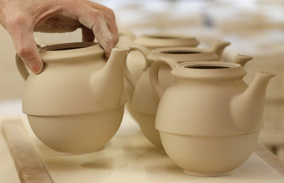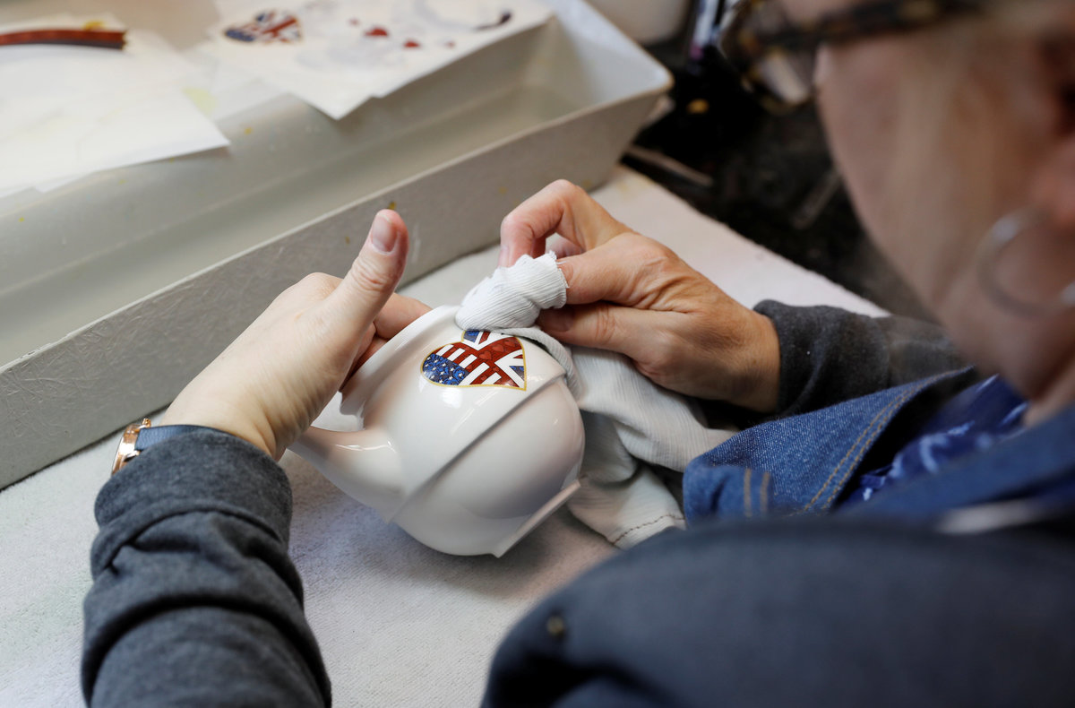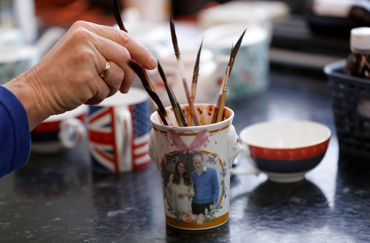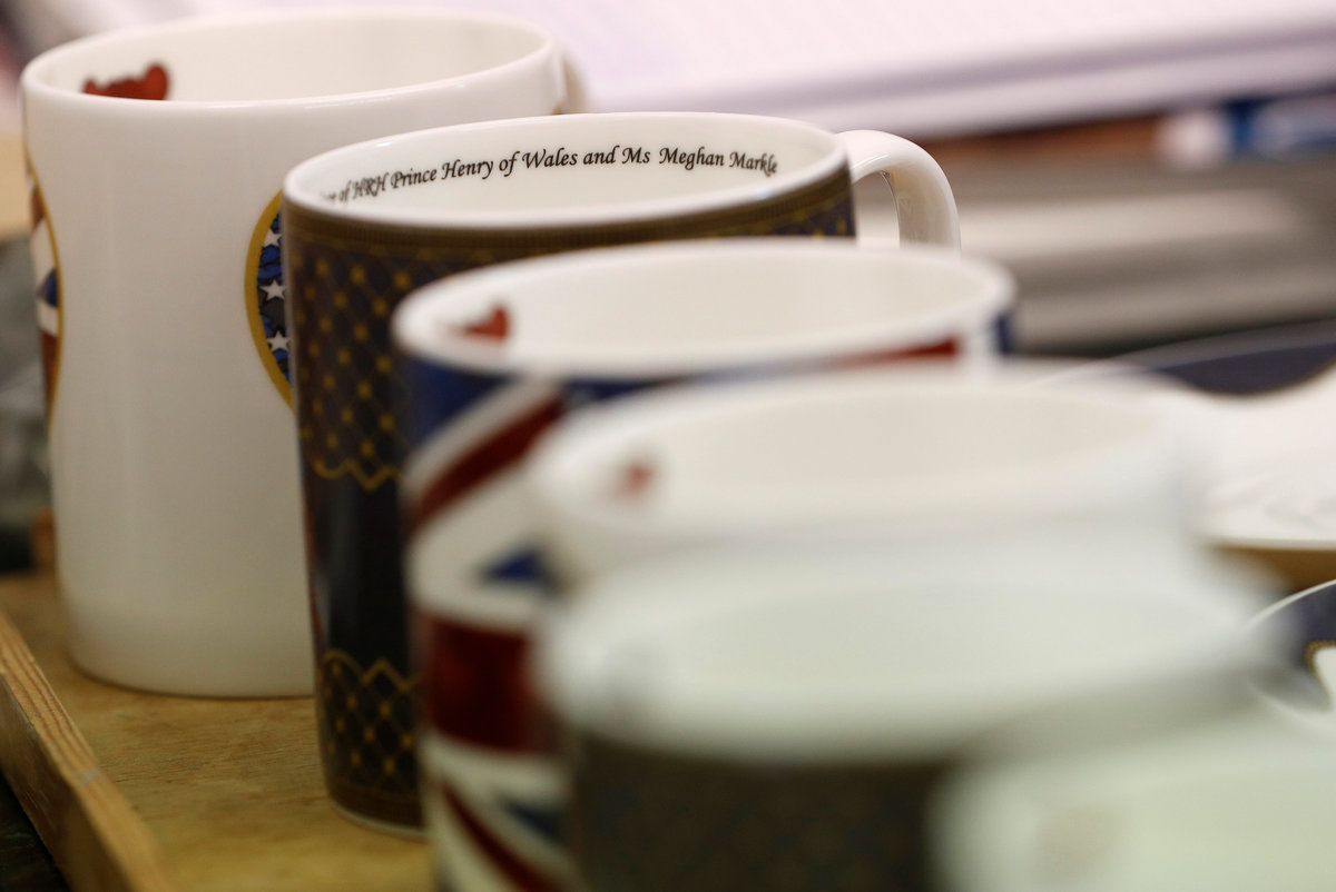 Bench Caster Steve Mason works on teapots made to celebrate the Royal Wedding between Prince Harry and Meghan Markle at Halcyon Days' Caverswall factory in Stoke-on-Trent, Britain February 27, 2018. REUTERS/Darren StaplesBench Caster Steve Mason works on teapots made to celebrate the Royal Wedding between Prince Harry and Meghan Markle at Halcyon Days' Caverswall factory in Stoke-on-Trent, Britain February 27, 2018. REUTERS/Darren StaplesChina made to celebrate the Royal Wedding between Prince Harry and Meghan Markle is displayed at Halcyon Days' Caverswall factory in Stoke-on-Trent, Britain February 27, 2018. REUTERS/Darren StaplesChina made to celebrate the Royal Wedding between Prince Harry and Meghan Markle is displayed at Halcyon Days' Caverswall factory in Stoke-on-Trent, Britain February 27, 2018. REUTERS/Darren StaplesA worker puts a heart on to a teapot made to celebrate the Royal Wedding between Prince Harry and Meghan Markle at Halcyon Days' Caverswall factory in Stoke-on-Trent, Britain February 27, 2018. REUTERS/Darren StaplesSue Carter places a brush into a cup depicting the Duke and Duchess of Cambridge whilst gilding pottery to celebrate the Royal Wedding between Prince Harry and Meghan Markle at Halcyon Days' Caverswall factory in Stoke-on-Trent, Britain February 27, 2018. REUTERS/Darren StaplesChina made to celebrate the Royal Wedding between Prince Harry and Meghan Markle is displayed at Halcyon Days' Caverswall factory in Stoke-on-Trent, Britain February 27, 2018. REUTERS/Darren Staples