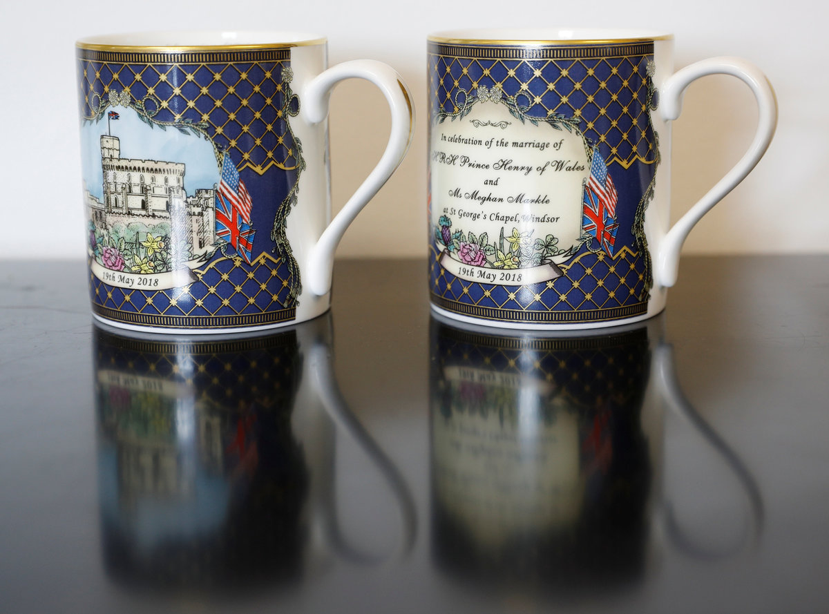 Mugs made to celebrate the Royal Wedding between Prince Harry and Meghan Markle wait to be guilded at Halcyon Days' Caverswall factory in Stoke-on-Trent, Britain February 27, 2018. REUTERS/Darren Staples