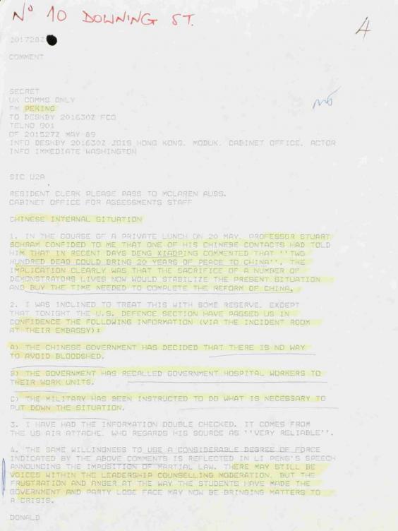 Sir Donald also included information from his lunch with American sinologist Stuart Schram, who said his Chinese contacts had reported Mr Xiaoping saying: "Two hundred dead would bring 20 years of peace to China."