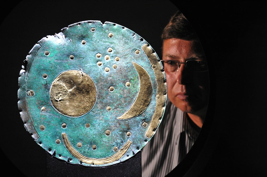 The 30cm bronze disc has a blue-green patina and is adorned with gold symbols thought to represent the sun, moon, stars, solstices and Pleiades constellation.