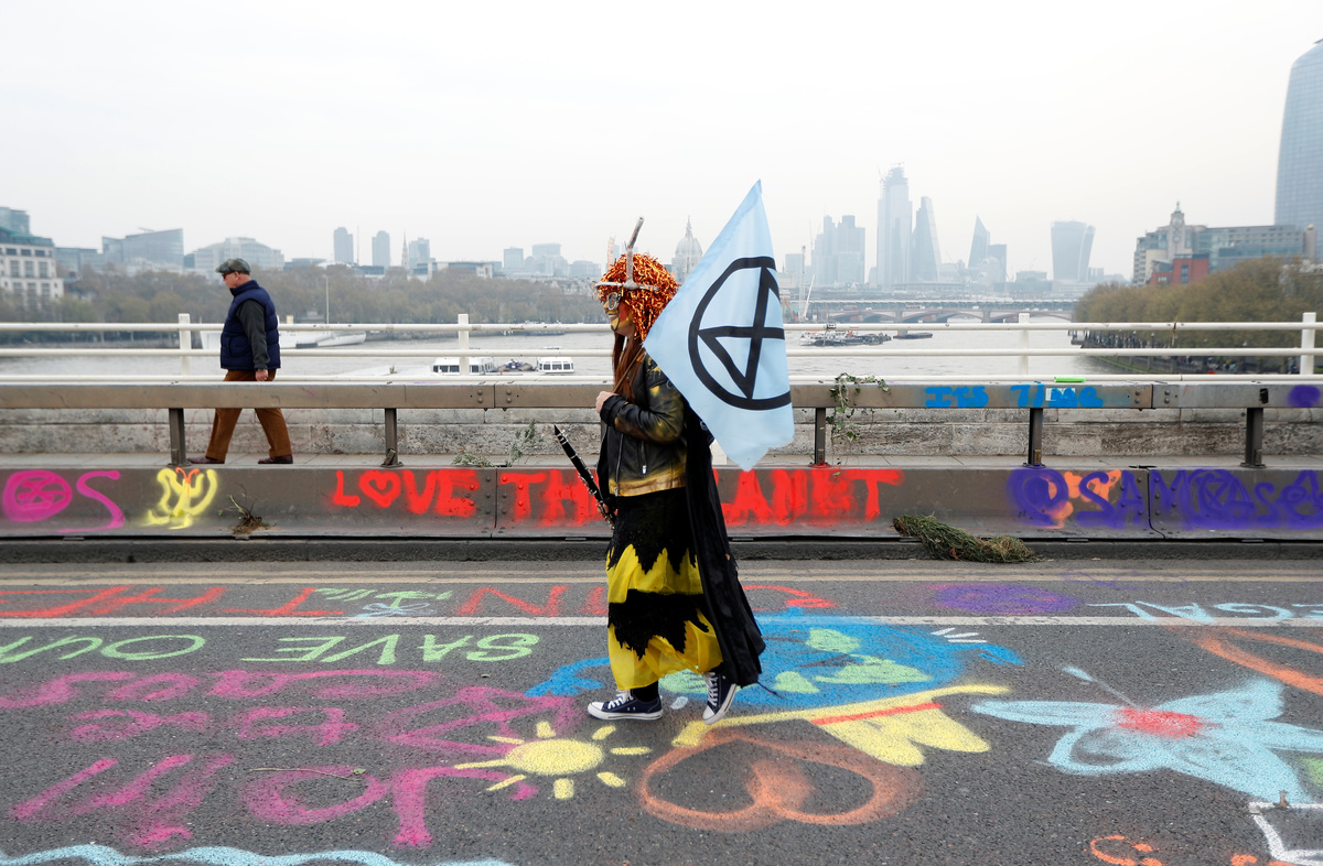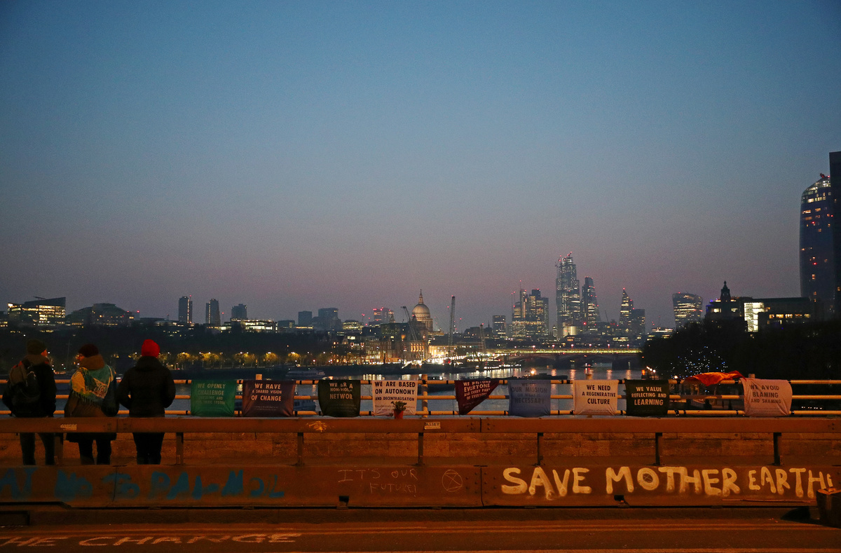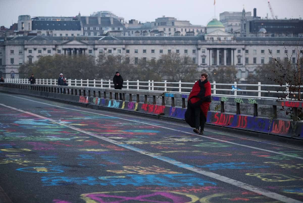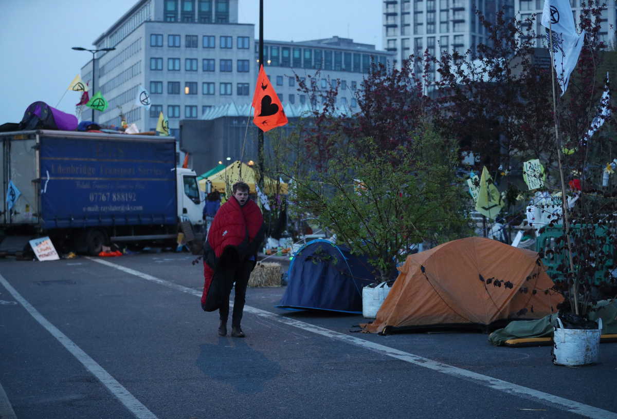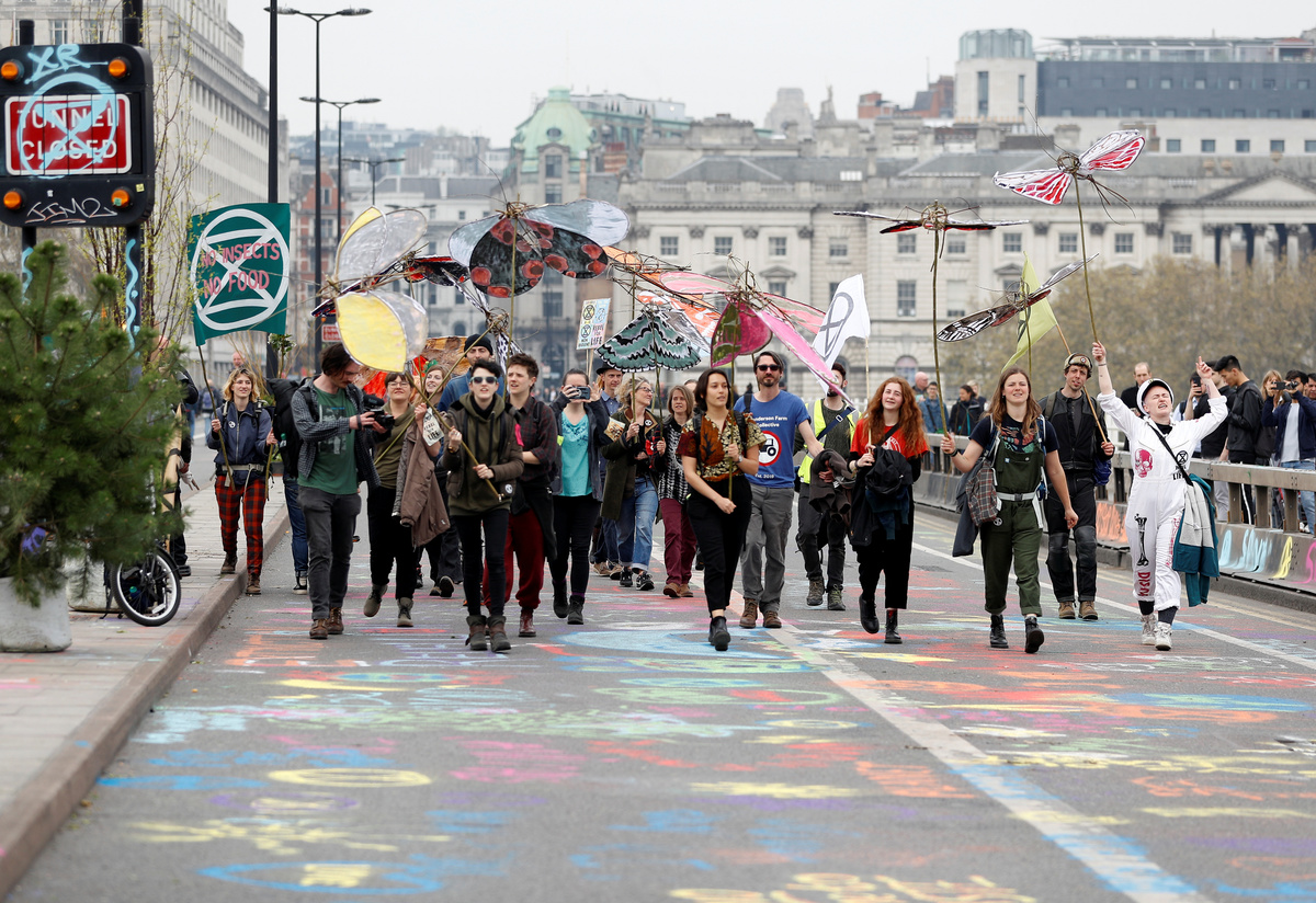 A climate change activist walks along Waterloo Bridge during a blockage during the Extinction Rebellion protest in London, Britain April 16, 2019. REUTERS/Hannah McKayA police officer approaches a climate change activist at Waterloo Bridge during the Extinction Rebellion protest in London, Britain April 16, 2019. REUTERS/Peter NichollsA climate change activist walks along Waterloo Bridge during a blockage during the Extinction Rebellion protest in London, Britain April 16, 2019. REUTERS/Hannah McKayClimate change activists arrive at Waterloo Bridge during the Extinction Rebellion protest in London, Britain April 16, 2019. REUTERS/Peter NichollsClimate change activists block Westminster Bridge during the Extinction Rebellion protest in London, Britain April 16, 2019. REUTERS/Peter NichollsA girl draws on the street of Waterloo Bridge during the Extinction Rebellion protest in London, Britain April 16, 2019. REUTERS/Hannah McKayProtesters sit on Waterloo Bridge during the Extinction Rebellion protest in London, Britain April 16, 2019. REUTERS/Hannah McKayPolice officers detain a climate change activist at Waterloo Bridge during the Extinction Rebellion protest in London, Britain April 16, 2019. REUTERS/Hannah McKayPolice officers detain a climate change activist at Waterloo Bridge during the Extinction Rebellion protest in London, Britain April 16, 2019. REUTERS/Peter NichollsClimate change activists sit in a boat on the River Thames during the Extinction Rebellion protest in London, Britain April 16, 2019. REUTERS/Peter NichollsA climate change activist walks across Waterloo Bridge during the Extinction Rebellion protest in London, Britain April 16, 2019. REUTERS/Peter NichollsClimate change activists block a road during the Extinction Rebellion protest at Parliament Square in London, Britain April 16, 2019. REUTERS/Hannah McKayClimate change activists rest during a Extinction Rebellion protest at Oxford Circus in London, Britain April 16, 2019. REUTERS/Hannah McKayClimate change activists rest during a Extinction Rebellion protest at Oxford Circus in London, Britain April 16, 2019. REUTERS/Hannah McKaySigns are seen near climate change activists resting during a Extinction Rebellion protest at Oxford Circus in London, Britain April 16, 2019. REUTERS/Hannah McKayA climate change activist walks between tents during a Extinction Rebellion protest at Marble Arch in London, Britain April 16, 2019. REUTERS/Hannah McKayClimate change activists sit on the road during a Extinction Rebellion protest at Marble Arch in London, Britain April 16, 2019. REUTERS/Hannah McKayA man sits in front of the tents of climate change activists during a Extinction Rebellion protest at Marble Arch in London, Britain April 16, 2019. REUTERS/Hannah McKayClimate change activists demonstrate during a Extinction Rebellion protest at Oxford Circus in London, Britain April 16, 2019. REUTERS/Hannah McKay