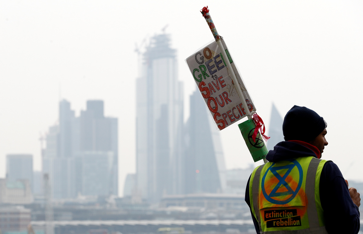 A climate change activist holds a placard at Waterloo Bridge during the Extinction Rebellion protest in London, Britain April 16, 2019. REUTERS/Peter Nicholls