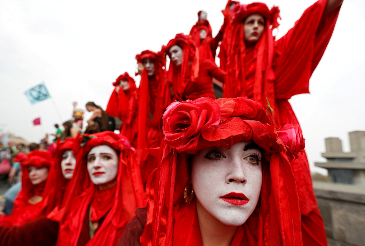Performers demonstrate at Waterloo Bridge during the Extinction Rebellion protest in London, Britain April 16, 2019. REUTERS/Peter Nicholls