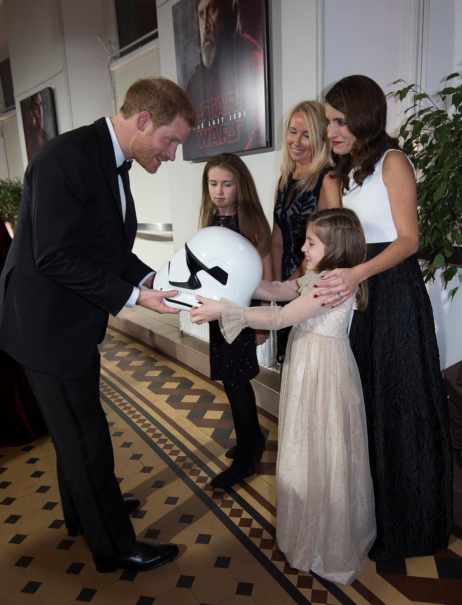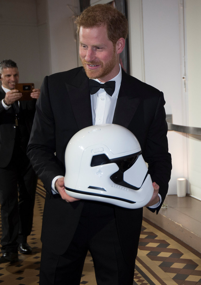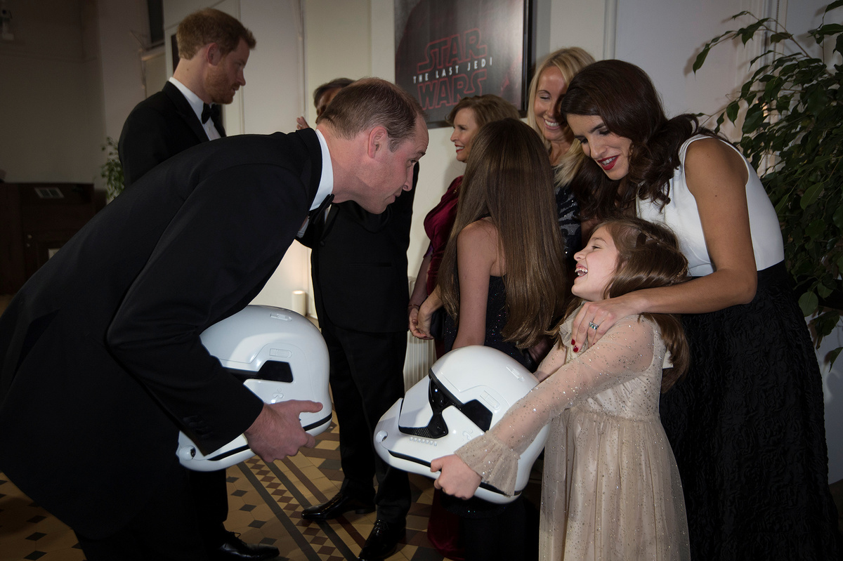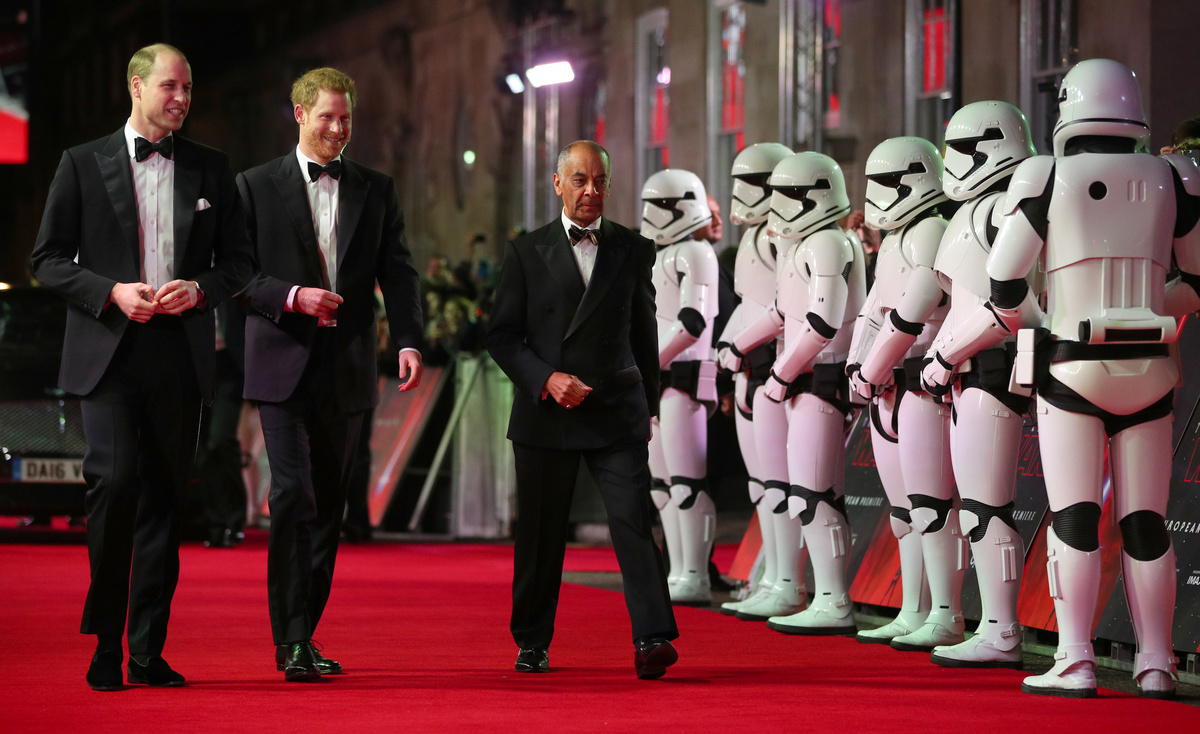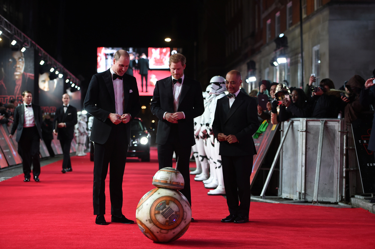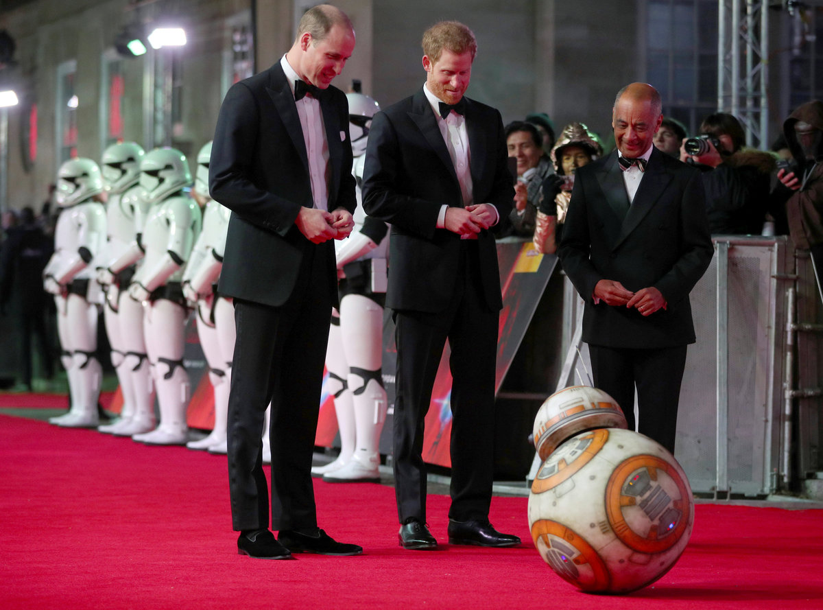 The princes appear in the film as storm-troopers, clad head-to-toe in the characters' signature white armor. During Tuesday's event, they were greeted on the red carpet by robot character BB8, and presented with souvenir storm-trooper helmets.