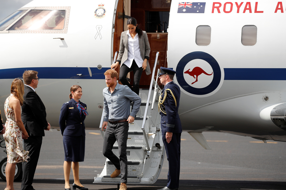 Britain's Prince Harry and Meghan, Duchess of Sussex, arrive at Dubbo airport, Dubbo, Australia October 17, 2018. REUTERS/Phil Noble
