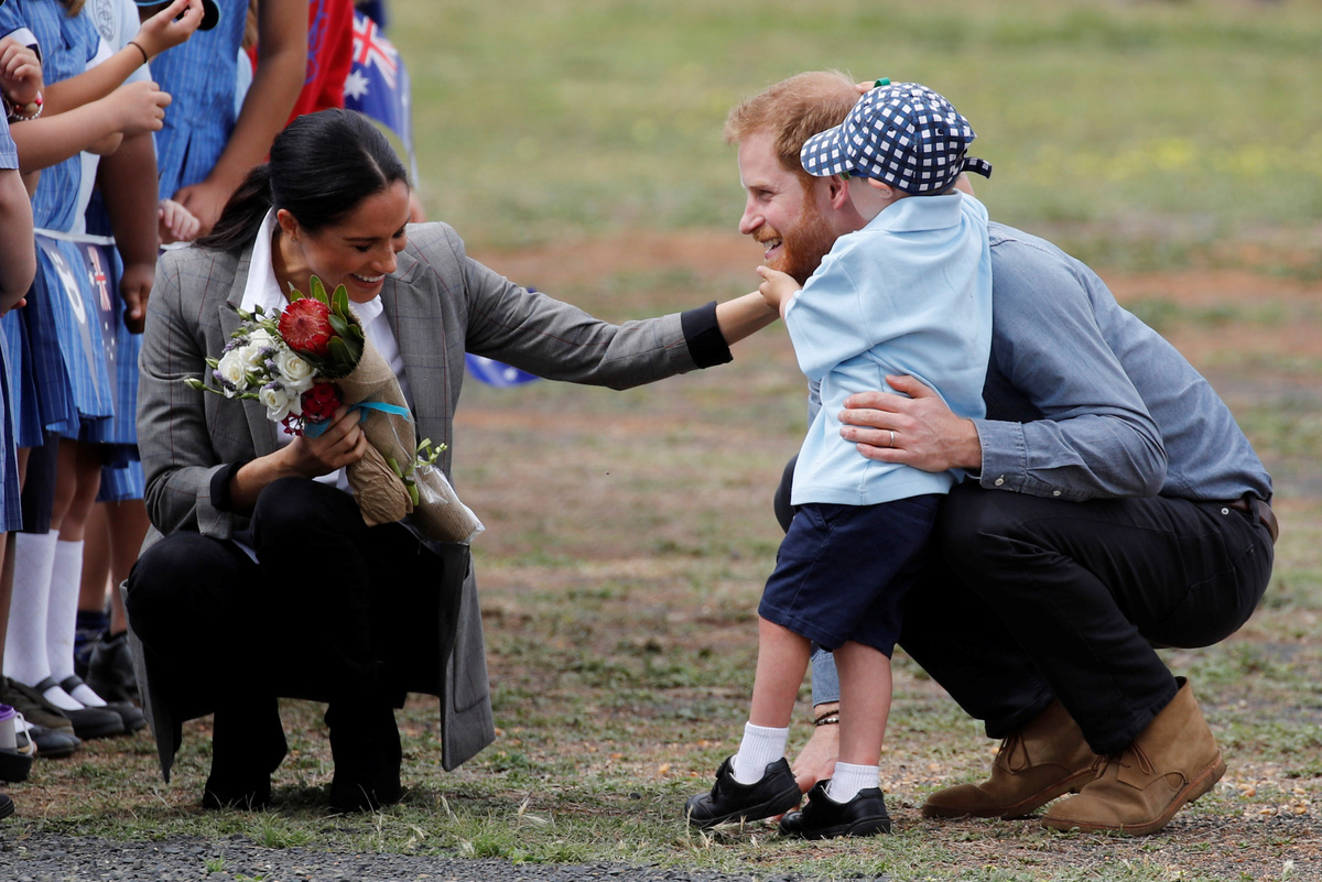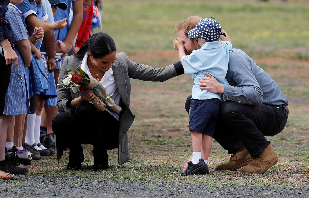 MELBOURNE (Reuters) - A 5-year-old boy tugged Prince Harry's red beard and scored big hugs from the British royal and his wife, Meghan, after they touched down on Wednesday in the rural Australian city of Dubbo, where farmers are struggling with drought.