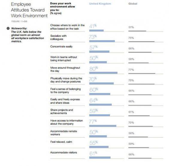 The UK was below average for employee's ability to change posture during the day, work in teams without being interrupted and concentrate easily on the task at hand.