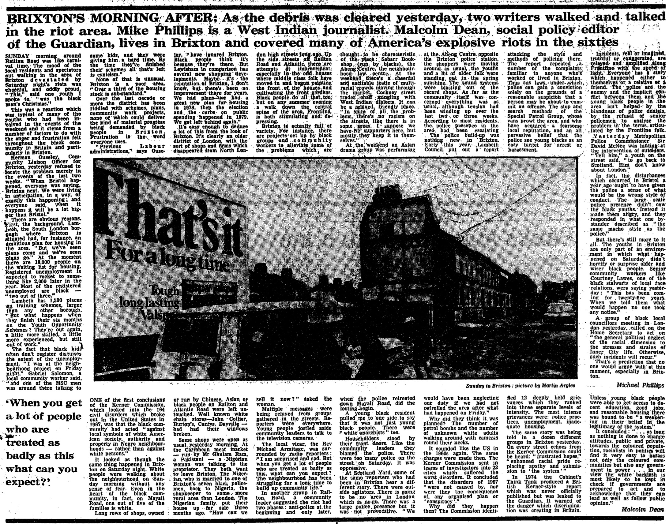 As the debris was cleared yesterday, two writers walked and talked in the riot area. Mike Phillips is a West Indian journalist. Malcolm Dean, social policy editor of the Guardian, lives in Brixton and covered many of America’s explosive riots in the sixties.